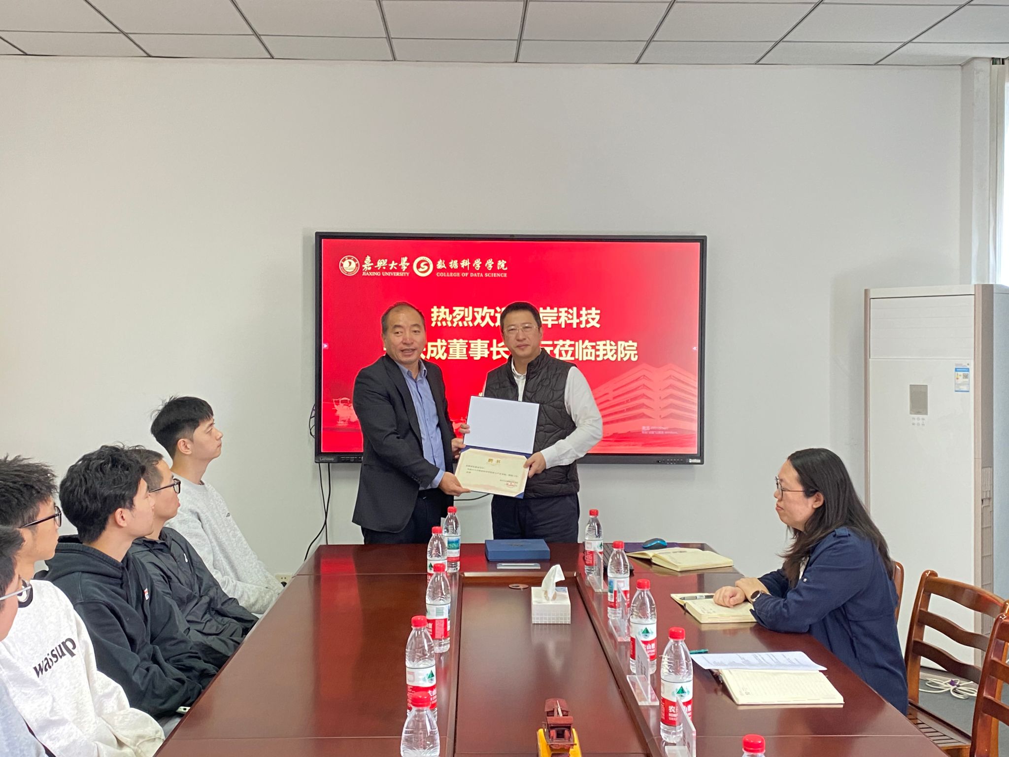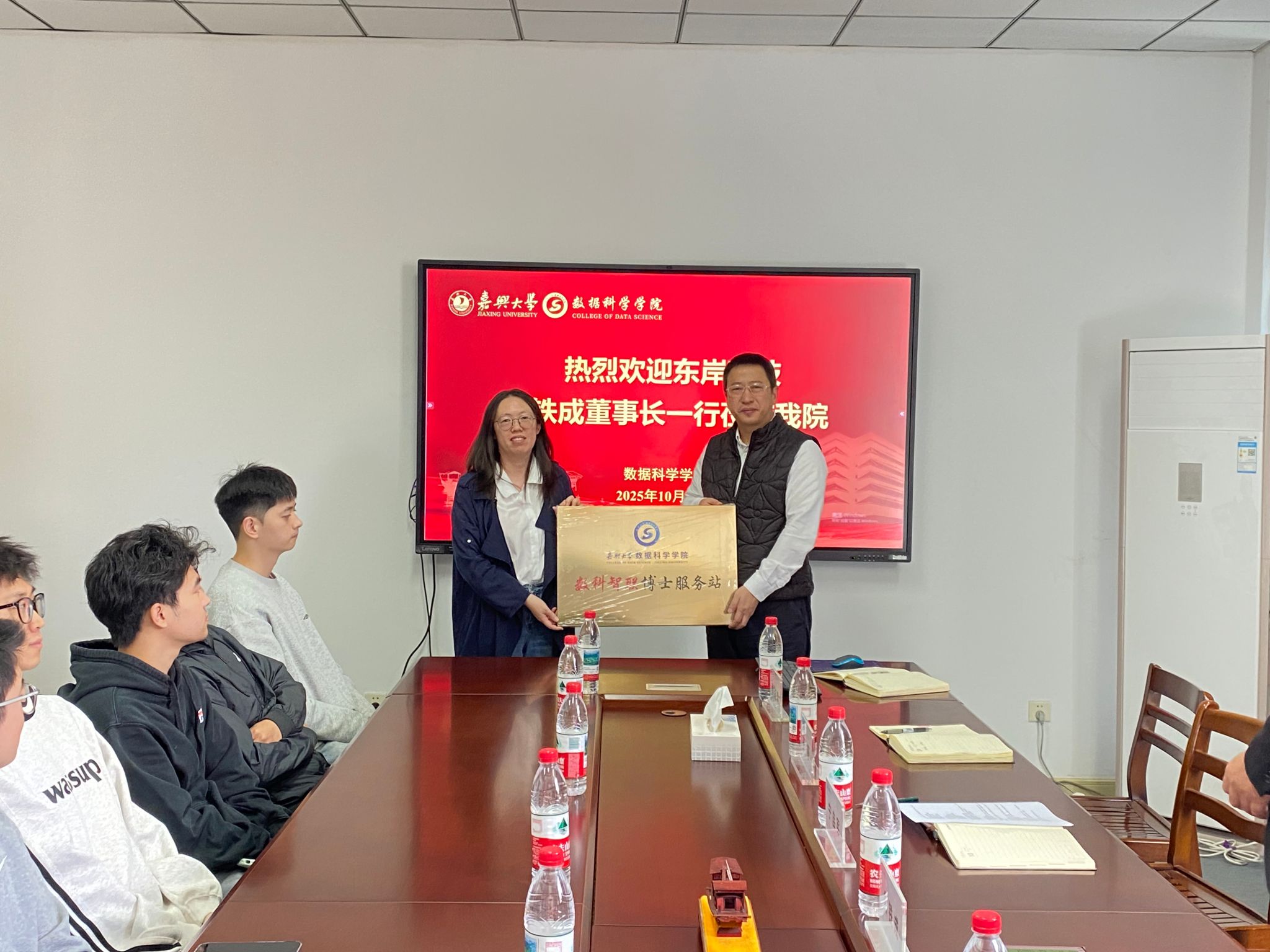 在讲座与交流结束后,学院举行了聘任与授牌仪式。院长宁自军代表学院为朱铁成董事长颁发硕士产业导师聘书,同时,副院长王薇为东岸科技“数科智联博士服务站”授牌,标志着双方在科研合作和高层次人才培养方面迈出新的步伐。