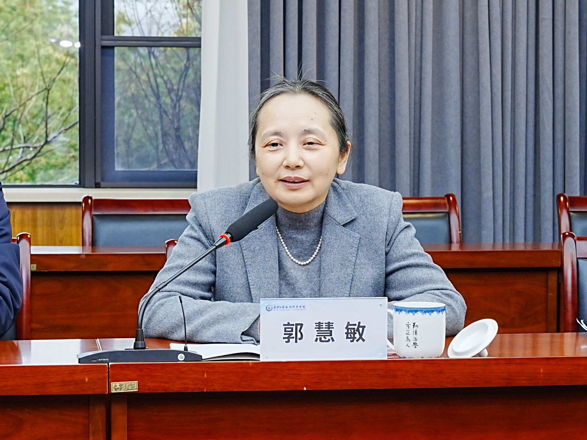 周宏伟对郭慧敏一行的到来表示欢迎,并简要介绍了学校发展历程、办学特色及统计学科建设情况。他指出,学校始终坚持服务地方经济社会发展的办学导向,统计学科作为学校传统特色学科,近年来主动融入数字经济发展大局,不断强化内涵建设与特色发展。依托“浙江省新经济统计研究嘉兴基地”,学校在新经济统计方法研究、数据分析与决策咨询等方面取得了积极成效,有力支撑了地方经济高质量发展。他表示,学校将以此次调研为契机,进一步深化校地合作机制,提升统计学科服务国家战略和区域发展的能力。