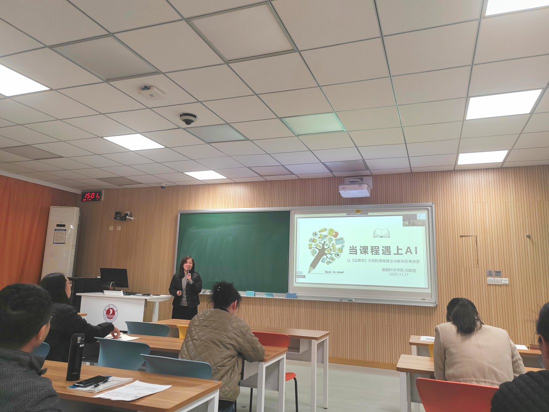 2025年11月27日下午,由学校教师发展中心主办,数据科学学院教师发展分中心承办的第13期教学沙龙在兴礼楼214教室成功举行。本期教学沙龙以“智启末来:AI赋能的数据科学与大数据专业建设及创新实践”为主题,由数据科学学院王薇副院长主持,任迎春老师担任主讲嘉宾,祝颖莲、董超峰、杨阳三位老师作为分享嘉宾。线上线下共有400余位师生参与本次活动。