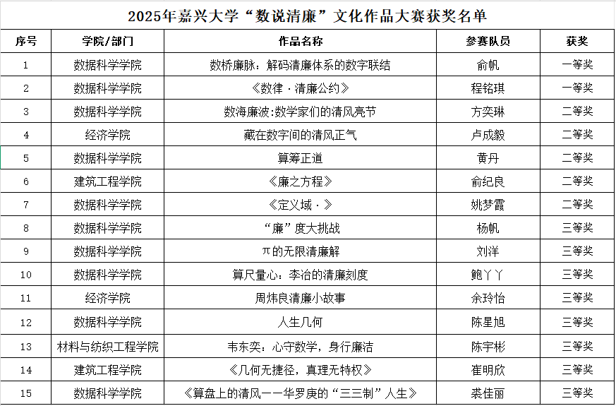 为扎实开展党纪学习教育,大力营造清正廉洁的校园文化氛围,深化“清廉嘉大”建设,推动学校全面从严治党向纵深发展。我院面向全校师生开展以“守廉洁初心,数校园清风 ”为主题的“数说清廉”文化作品大赛活动。本次大赛共收到各类作品61件,经大赛评委会评选,最终评选出一等奖作品2件、二等奖作品5件、三等奖作品8件。现将获奖作品名单予以公示,详见附件。