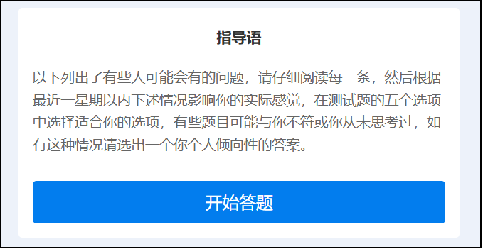 1、本次测量只是了解您近期的心理状态,每道题的答案无所谓对错。在测试过程中,不用过多考虑应该怎样,也不要与他人商量讨论,只需根据自己的真实情况凭第一感觉回答即可。学校会对您的测试结果保密。